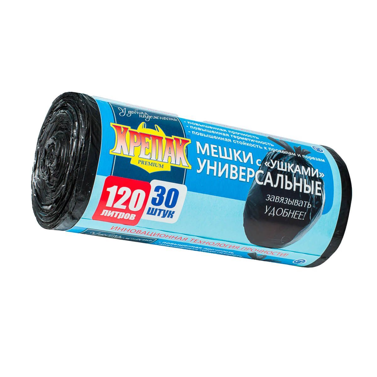 Мешки для мусора 120 л, с ушками, черные, в рулоне 30 шт., ПНД, 15 мкм, 1100х700 мм, Крепак, 4607075710375
